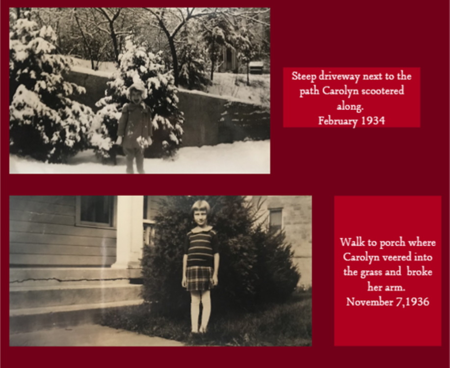 It was August of 1936, a month before Carolyn was to start school. The air was cool against her cheeks, and the ground was wet after a big rain. Following the storm Carolyn asked to scooter on the front walk. From the main road, her house sunk into a ravine. She started her ride on the walkway at the stairs which came down from the street. The walkway curved in an S shape, bending right and then left ending at the porch. As she rode her scooter down the walkway she picked up a lot of velocity and followed the S curve. Instead of crashing into the porch, she veered into the grass in the yard, so she could slow down enough until and hop off. Her super neat father had dug out a gulley and while veering into the grass, her wheel suddenly got twisted in the ditch between the side walk and the grass. Carolyn propelled in to the yard and as she fell she folded her elbow in and landed elbow first into the sod. Upon falling into the soft dirt, the bone in her left arm snapped, just above the joint in the forearm.