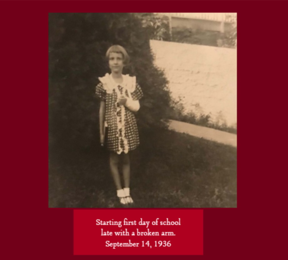 Carolyn was in a cast for six weeks after getting her arm set. She started school late, and registered for first grade on the last day possible, September 30th. When Carolyn was able to take off her cast, she had to do various exercises. There was not any physical therapy back then and the doctors gave her mother instructions as to how to care for and strengthen her arm. Carolyn was instructed to lie flat on a bed with an iron doorstop tied to her wrist. It was five inches long and an inch wide with a Bronco horse rearing back. She repeatedly curled her arm with this heavy iron doorstop tied to her wrist until she gained her strength back.