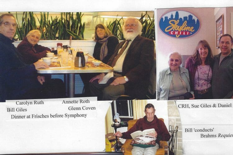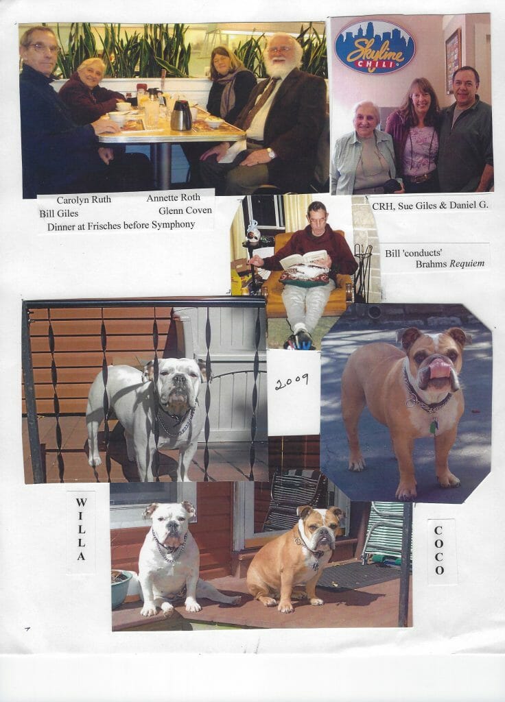 Last year’s letter ended on a cliff hanger about Bill. I was on the phone with him in W.Va. almost every day thru December as he finally talked himself into coming to Cincinnati instead of Florida for 2nd opinion doctor visits. I drove down and got him at the end of Dec and he stayed here til mid- Feb – almost 8 weeks. I was with him 24/7 during that time. He would proudly announce to one and all: “I’m Senile ” followed vehemently with―”but I don’t have Alzheimer’s!!” Besides Dr. visits and tests, our days were spent revisiting the past. We went to the Christ Church Boar’s Head festival that Bill sang in for over 15 years; attended every Cin Symphony concert (he loved the music and also loved criticizing/complaining about the conductors). At home he would sit listening to CD’s and conduct them as he read the vocal scores. We drove around Cincy visiting places where he lived and worked; saw old friends from years past, and we talked, and talked, & talked. In spite of some challenges handling his perceptions and temper, those days are very dear and precious to me now. When winter snows abated, I drove him back to W. Va. mid Feb for 6 weeks – & again was on the phone with him almost every day.