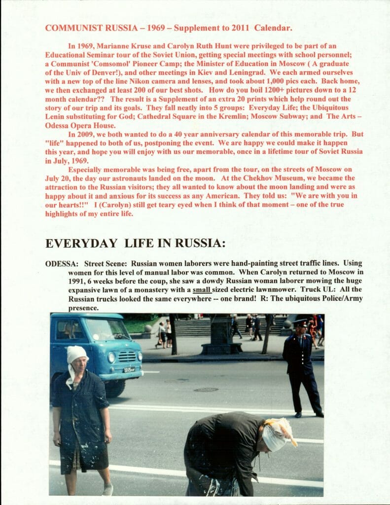 In 1969, Marianne Kruse and Carolyn Ruth Hunt were privileged to be part of an Educational Seminar tour of the Soviet Union, getting special meetings with school personnel; a Communist ‘Comsomol’ Pioneer Camp; the Minister of Education in Moscow ( A graduate of the Univ of Denver!), and other meetings in Kiev and Leningrad. We each armed ourselves with a new top of the line Nikon camera and lenses, and took about 1,000 pics each. Back home, we then exchanged at least 200 of our best shots. How do you boil 1200+ pictures down to a 12 month calendar?? The result is a Supplement of an extra 20 prints which help round out the story of our trip and its goals. They fall neatly into 5 groups: Everyday Life; the Ubiquitous Lenin substituting for God; Cathedral Square in the Kremlin; Moscow Subway; and The Arts – Odessa Opera House.