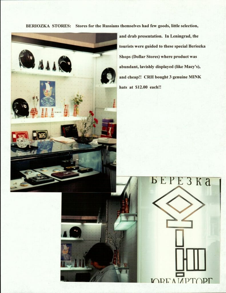 BERIOZKA STORES: Stores for the Russians themselves had few goods, little selection, and drab presentation. In Leningrad, thetourists were guided to these special Beriozka Shops (Dollar Stores) where product was abundant, lavishly displayed (like Macy’s), and cheap!! CRH bought 3 genuine MINK hats at $12.00 each!!