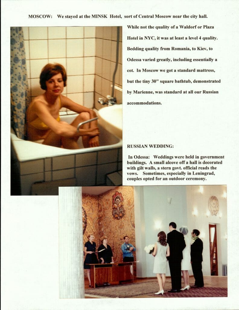 MOSCOW: We stayed at the MINSK Hotel, sort of Central Moscow near the city hall. While not the quality of a Waldorf or Plaza Hotel in NYC, it was at least a level 4 quality. Bedding quality from Romania, to Kiev, to Odessa varied greatly, including essentially a cot. In Moscow we got a standard mattress, but the tiny 30″ square bathtub, demonstrated by Marienne, was standard at all our Russian accommodations.