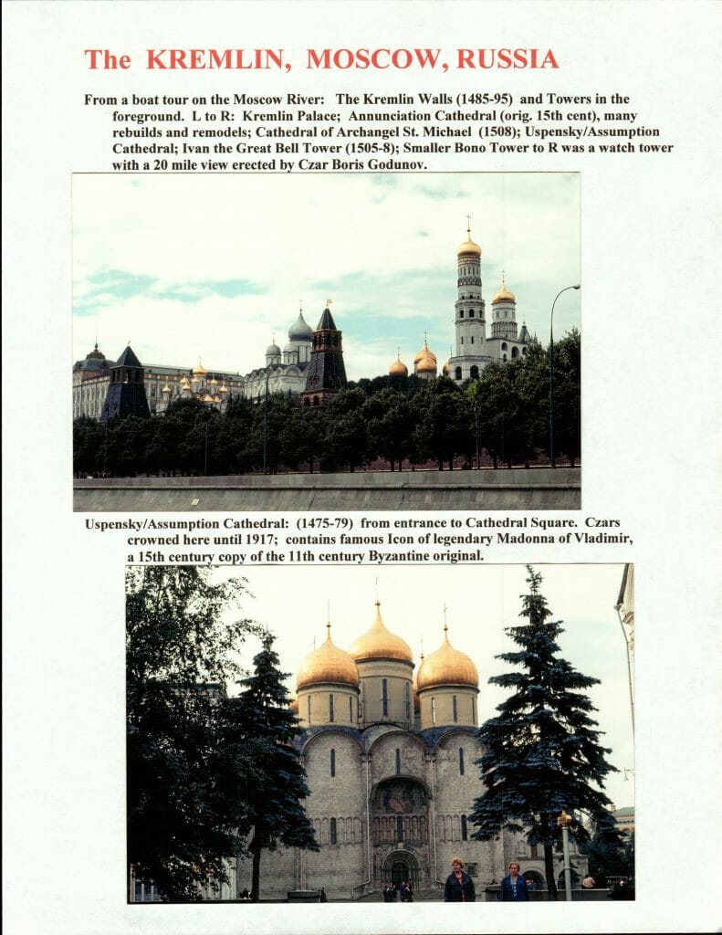 The KREMLIN, MOSCOW, RUSSIA From a boat tour on the Moscow River: The Kremlin Walls (1485-95) and Towers in the foreground. L to R: Kremlin Palace; Annunciation Cathedral (orig. 15th cent), many rebuilds and remodels; Cathedral of Archangel St. Michael (1508); Uspensky/Assumption Cathedral; Ivan the Great Bell Tower (1505-8); Smaller Bono Tower to R was a watch tower with a 20 mile view erected by Czar Boris Godunov.
