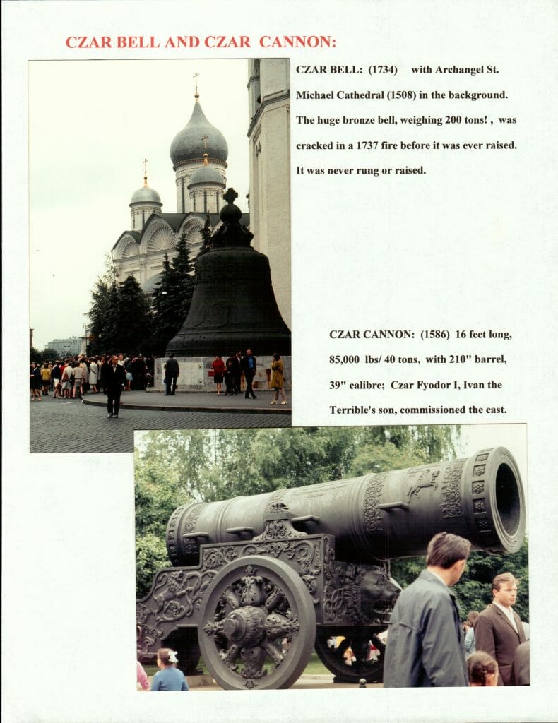 CZAR BELL AND CZAR CANNON: CZAR BELL: (1734) with Archangel St. Michael Cathedral (1508) in the background. The huge bronze bell, weighing 200 tons! , was cracked in a 1737 fire before it was ever raised. It was never rung or raised.