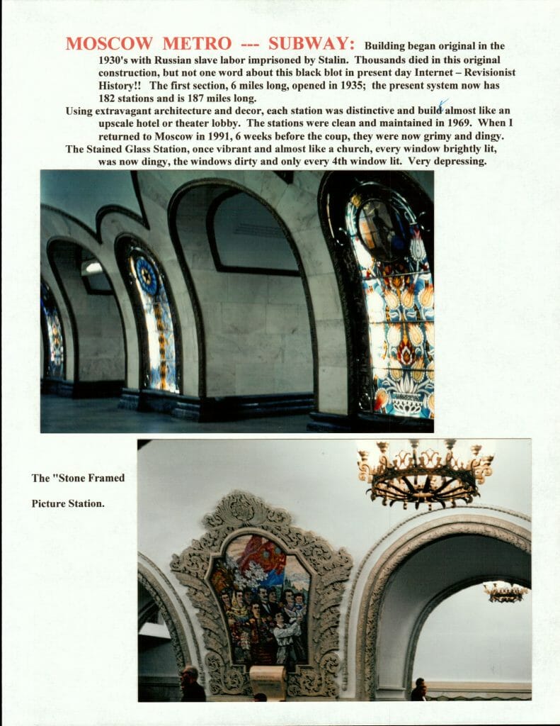 MOSCOW METRO — SUBWAY: Building began original in the 1930’s with Russian slave labor imprisoned by Stalin. Thousands died in this original construction, but not one word about this black blot in present day Internet – Revisionist History!! The first section, 6 miles long, opened in 1935; the present system now has 182 stations and is 187 miles long.
