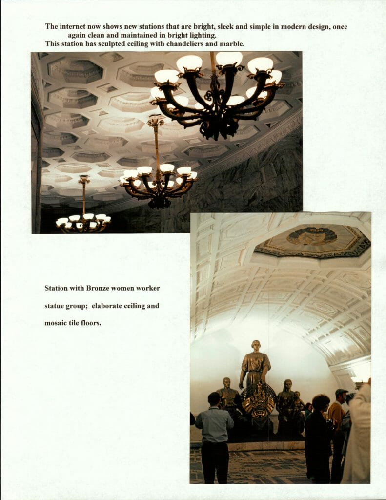 Using extravagant architecture and decor, each station was distinctive and build almost like an upscale hotel or theater lobby. The stations were clean and maintained in 1969. When I returned to Moscow in 1991, 6 weeks before the coup, they were now grimy and dingy.
