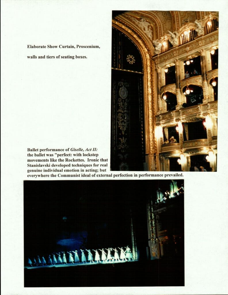 Ballet performance of Giselle, Act II: the ballet was “perfect: with lockstep movements like the Rockettes. Ironic that Stanislavski developed techniques for real genuine individual emotion in acting; but everywhere the Communist ideal of external perfection in performance prevailed.