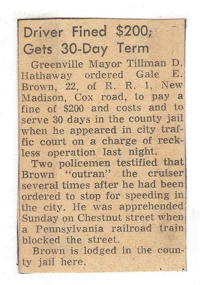 Gale E. Brown – Driver Jailed for Police Chase, c. 1961 December 31, 1961 Lee Elbert Brown Gale E. Brown – Driver Jailed for Police Chase, c. 1961