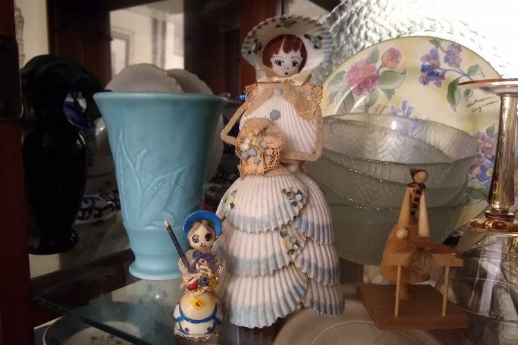 And in a gift shop in Clearwater, I found a beautiful 10″ doll made completely of seashells. This seashell doll was ‘dressed’ like a late 18th century lady in a gown with the edges of each of the white shells rimmed in 1/4 inch pale blue paint; a small shell, painted as a face, was set reversed into a larger shell that acted like a sunbonnet. It was her favorite ornamental doll, through all her many moves over the next 35 years, holding a place of honor on her dresser.